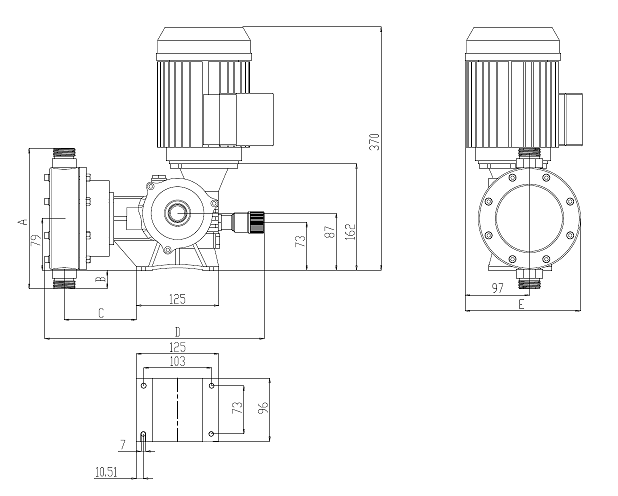 電機(jī)驅(qū)動(dòng)主軸連接的蝸輪蝸桿減速箱形成減速機(jī)械結(jié)構(gòu),軸承在偏心軸上的偏心部分,偏心軸在減速箱輸出軸的帶動(dòng)下旋轉(zhuǎn),軸承在偏心軸的偏心圓上做偏心運(yùn)動(dòng),所產(chǎn)生的偏心距轉(zhuǎn)換成推桿的直線運(yùn)動(dòng),在彈簧回復(fù)力的配合下推桿帶動(dòng)膜片做直線往復(fù)運(yùn)動(dòng),往復(fù)循環(huán)一次叫做沖程,往復(fù)的距離叫做沖程長(zhǎng)度,每分鐘往復(fù)的次數(shù)稱為沖程頻率。